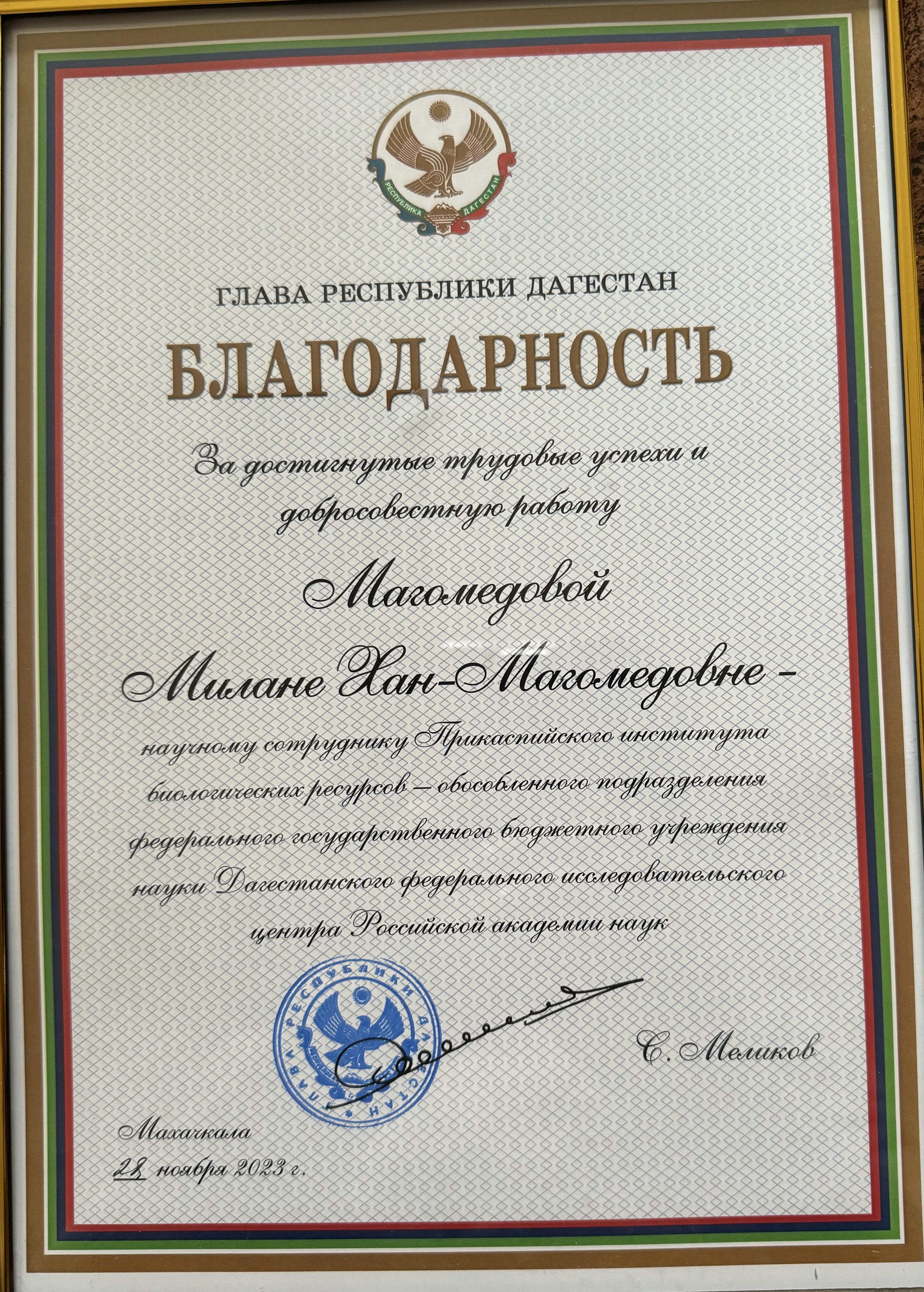 Коллектив ПИБР ДФИЦ РАН сердечно поздравляет сотрудников института, отмеченных заслуженными наградами в связи с Юбилеем Российской академии наук: Магомедова Магомед-Расула Дибировича – Почетной грамотой Народного собрания Республики Дагестан и юбилейной медалью «300 лет Российской академии наук», Абдуллабекову Динаханум Абиляевну – Почетной грамотой Правительства Республики Дагестан, Аливердиеву Динару Алиевну и Магомедову Милану Хан-Магомедовну – Благодарностью Главы Республики Дагестан.